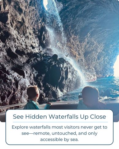 Discover the breathtaking beauty of the Na Pali Coastline with our locally owned and operated family business. Explore ancient sea caves, glide under refreshing waterfalls, and encounter dolphins and sea turtles along the way. Marvel at the towering cathedral cliffs, lush green valleys, and secluded white sand beaches—this coastline is truly one of the most stunning in the world.